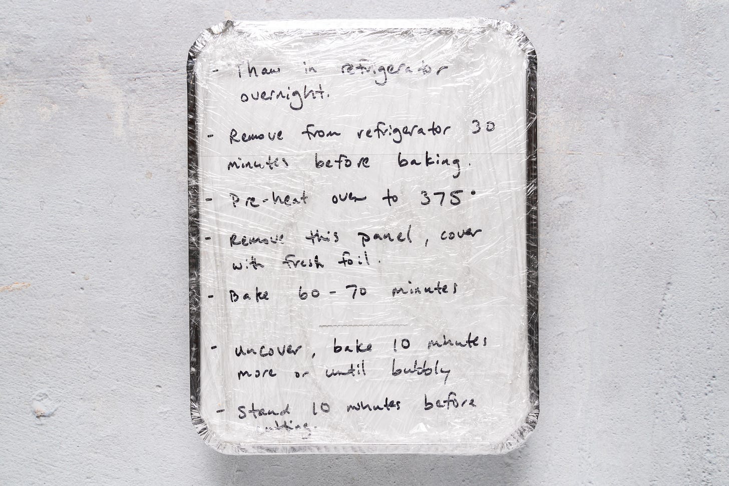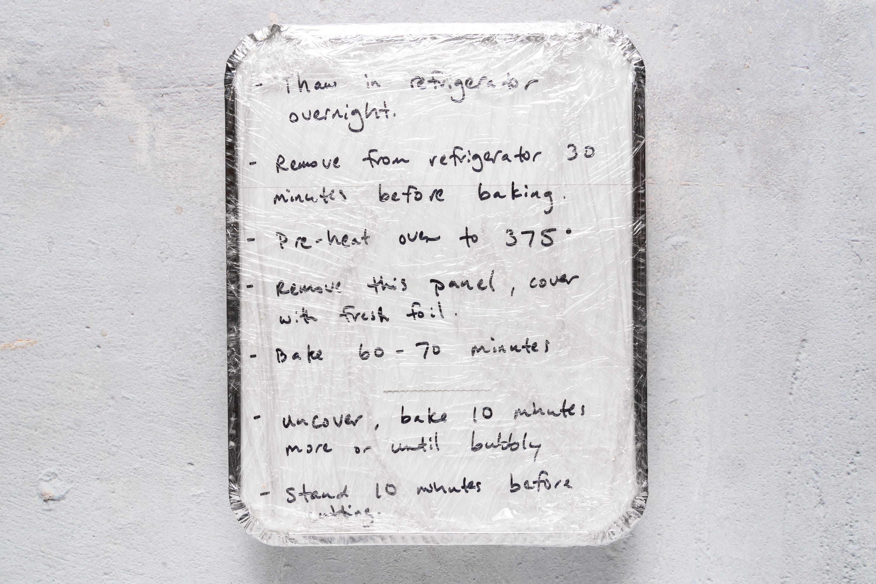 Find the pans that come with a flat panel lid instead of the raised plastic top. These are great because you can use the white side of the panel to write out the defrosting and baking instructions. (Hopefully with better handwriting than mine! Sometimes I even print it out and tape it on instead.)